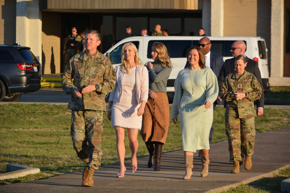 101st Commander, Major General JP McGee and CSM Veronica Knapp along with guests prepare to meet First Lady Dr. Jill Biden as she arrives at Fort Campbell, on Mar. 9 2022. (Lee Erwin)