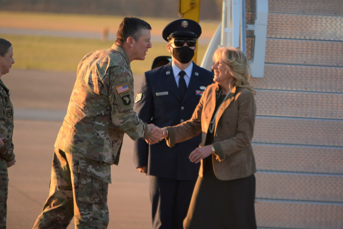 101st Commander, Major General JP McGee greets First Lady Dr. Jill Biden at Fort Campbell, on Mar. 9 2022. (Lee Erwin)