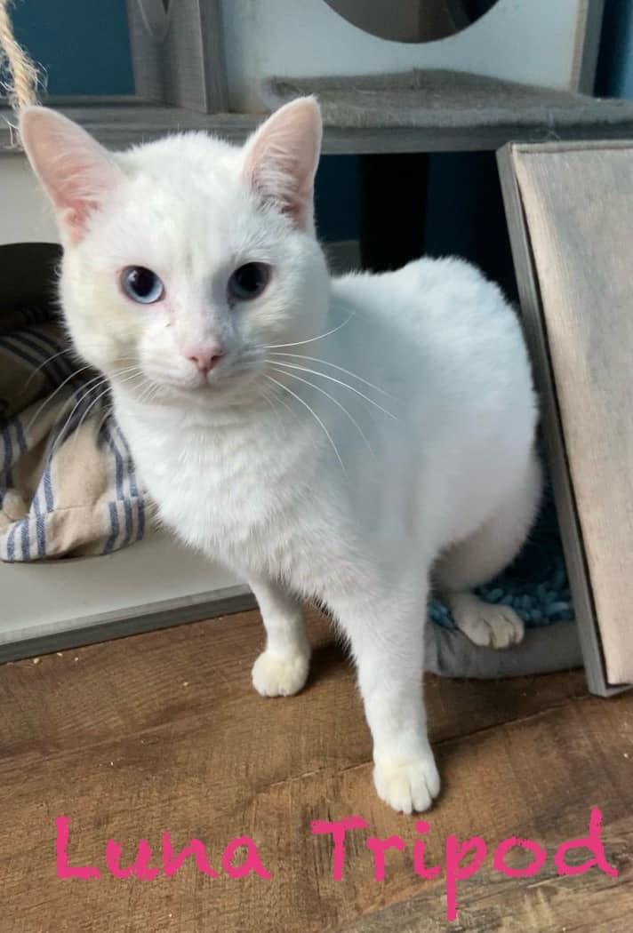 Luna Tripod is a young 7 or 8 month old white female Domestic shorthair. She was taken to the shelter with a badly injured leg that eventually had to be amputated but she is managing just fine as a sweet Tripod! Rescue stepped in and she is currently in a foster home ready for her forever family. Luna prefers to be the only pet in the home and needs a calmer, quiet home. Luna is fully vetted, litter trained and spayed. She will be a delightful companion for a single person or possibly a retired couple who will continue to spoil her. To fill out an application, set up a meet and greet and for more information on all the cats please go to https://www.puurrrfectpawsrescue.com or message them through their FB page, Puurrrfect Paws Rescue.