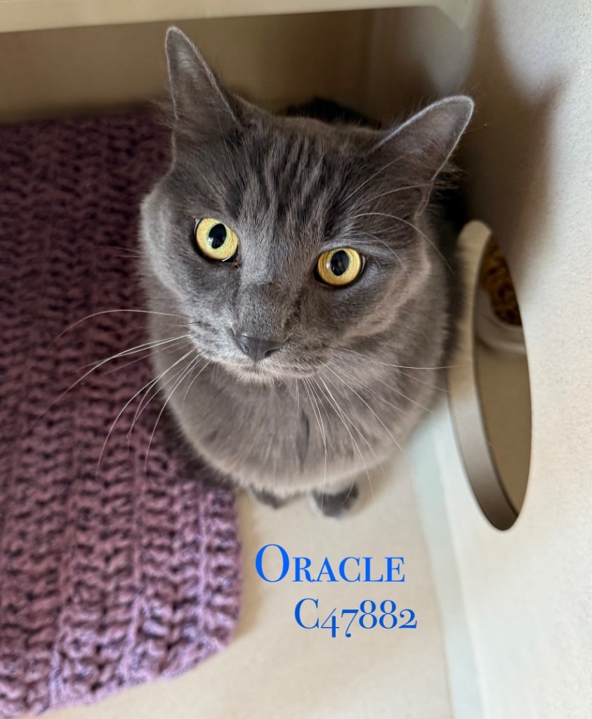 Oracle is an adult male Domestic Medium hair mix. He is fully vetted, litter trained and neutered. Very sweet boy, loves all the attention and will be a wonderful companion. Come see him in the Cat Room.